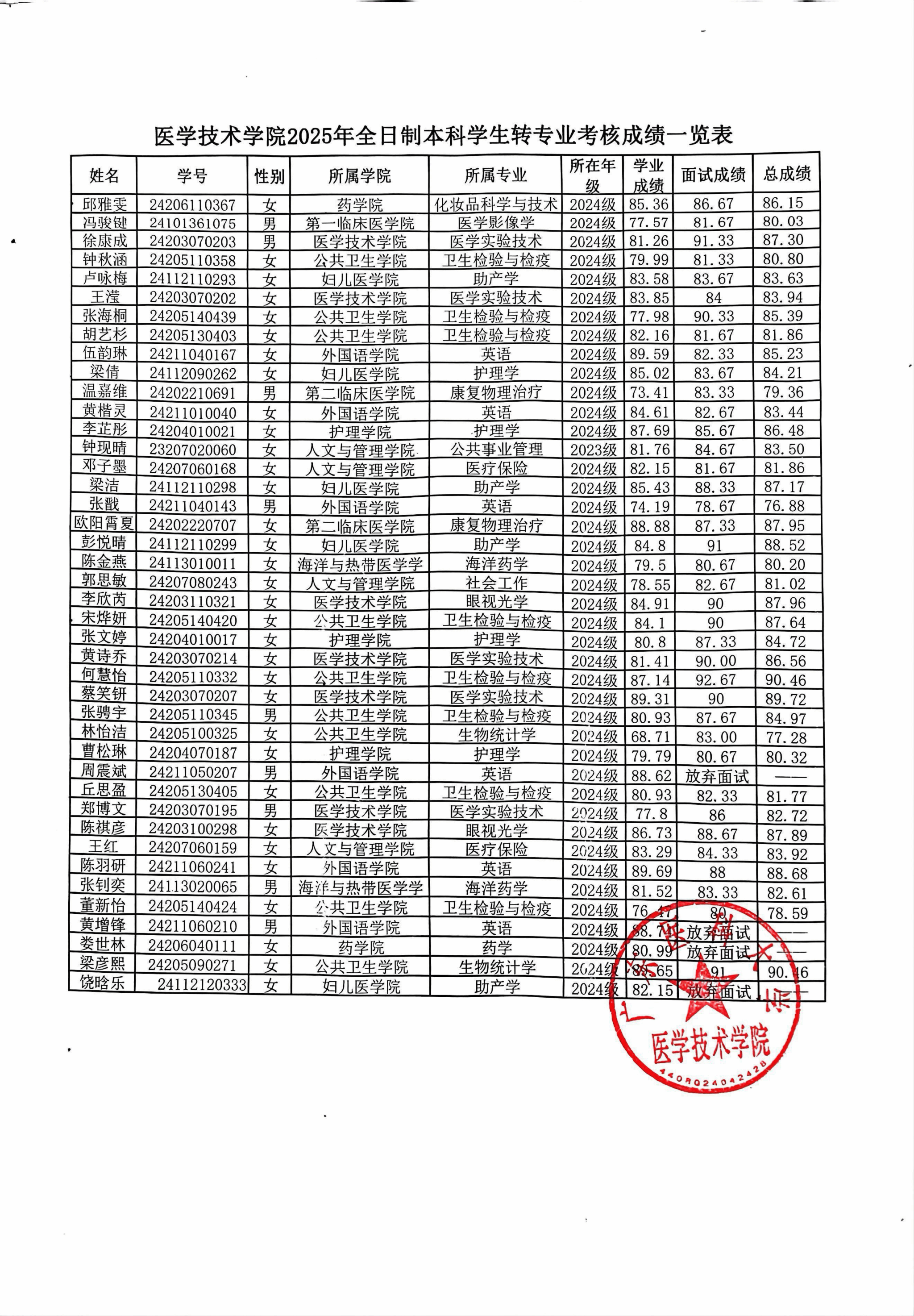 根据教务部《关于做好2025年全日制本科学生转专业相关工作的通知》要求,按照《广东医科大学全日制本科学生转专业实施办法(修订)》(校教务〔2025〕13号)有关文件精神,英国上市公司365坚持公开、公平、公正的原则,对符合条件的42名学生进行了面试考核,现将2025年英国上市公司365全日制本科学生转专业考核成绩予以公示(详见附件)。