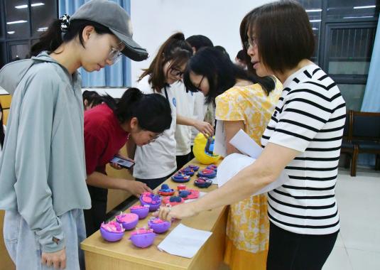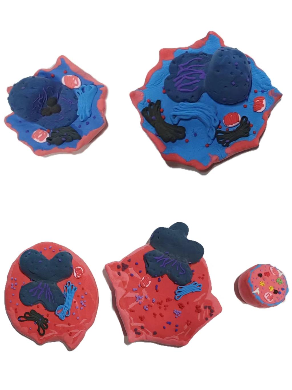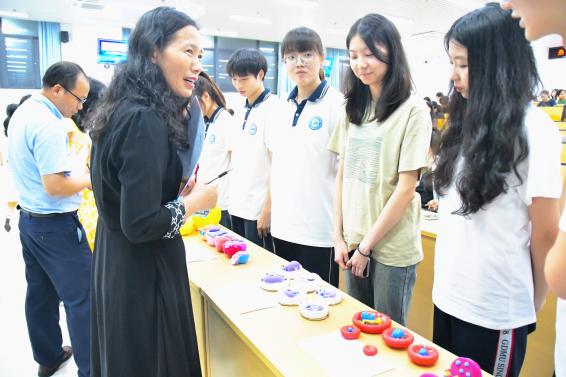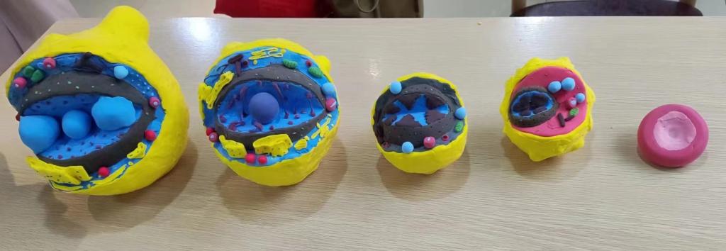 各组选手将自己精心制作的作品置于台上,这些模型制作精美,而且富有创意,生动地展现了细胞内部的复杂结构。选手们向评委介绍自己的模型,讲述对所选细胞系统的认知及制作构想,并回答评委的提问。在轻松愉快的氛围中,师生们就细胞模型的制作、细胞结构等话题展开了讨论。选手们在与老师的交流中,查漏补缺,增进自身对细胞超微结构的理解。