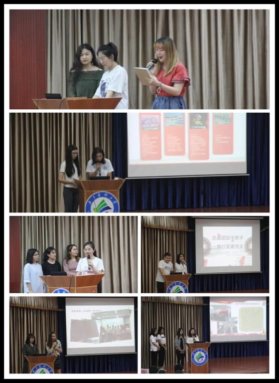 活动在雄伟的国歌声中拉开帷幕。由32名新疆少数民族学生组成的7支队伍依次上台展示。七支队伍的展示内容各具特色,内容丰富。他们不仅介绍了家乡的美景及变化,分享了家乡的美食,还讲述了他们在假期所做的丰富多彩社会实践活动。例如:国旗下发声亮剑、红领巾小课堂、返乡大学生座谈会、社区春节联欢会,入户走访送温暖等。让我们印象最深刻的是他们每周一的升旗仪式和国旗下发声亮剑。国旗下的声音承载着国家的使命,是家乡的希冀,更是肩上的重任。在展示环节中,阿里米拉小组还别出心裁为我们带来了热情奔放的新疆舞和难忘的新疆美食,引来阵阵掌声。