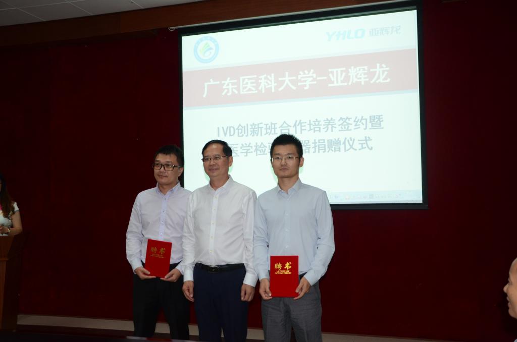 7月4日晚,深圳市亚辉龙生物科技股份有限公司(下称“亚辉龙公司”)副董事长兼总经理宋永波先生、副总经理兼首席科学家夏福臻先生等一行十余人来校参加在东莞校区实验平台635室学术报告厅隆重举行的“广东医科大学-亚辉龙体外诊断产业技术创新班合作培养签约暨医学检验仪器捐赠仪式”(下称签约捐赠仪式)。广东医科大学参加会议的有学校副校长刘新光教授、校学工部谭秋浩部长、校教务处贾振斌副处长、校社会合作处陈军副处长、医学检验学院院长徐军发教授、党委宁静书记以及学院其他领导、各科室正副主任以及部分学生代表。