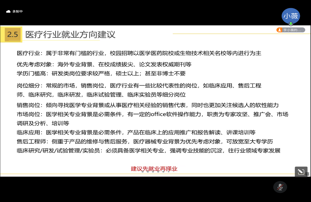 在就业能力提升经验分享会环节,优秀校友李小薇向同学们分享了自己的求职经历和经验,就考研、就业创业、出国深造等同学们关心的问题进行了分析探讨,介绍了当前严峻的就业形势、医学检验/实验技术专业毕业生的主要就业渠道及就业准备、体外诊断行业的产业链及细分领域的未来发展前景。她结合自身的成长经验,建议同学们先就业再择业,要立足现实,制定目标,擅用所学专业赋予自己底气与能量,在求职就业中拓宽思路,在不断总结经验中前行。