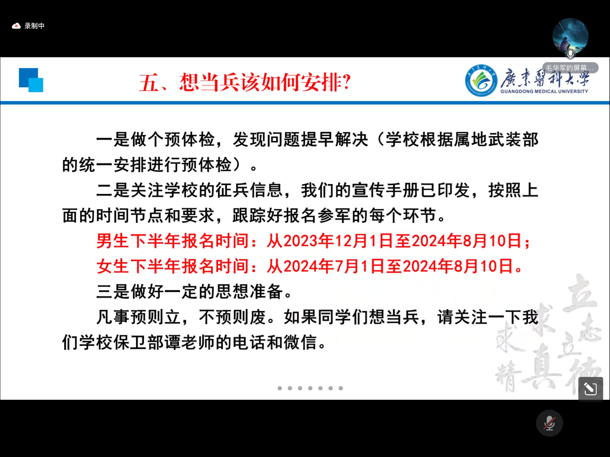 随后,学校保卫部(武装部)毛华军副部长作征兵政策宣讲。他从现阶段我军的现状、应征入伍在个人成长中的作用、大学生入伍退伍政策、如何选择入伍等方面为同学们进行了详细的讲解。通过征兵政策宣传,让同学们了解了军队在国防安全、和平年代保障国家安全稳定的重要性,增强了同学们对国家安全的认识和意识,激发了同学们的爱国情感,他号召同学们积极参军入伍,携笔从戎保家卫国,为国家的安全和稳定做出贡献。