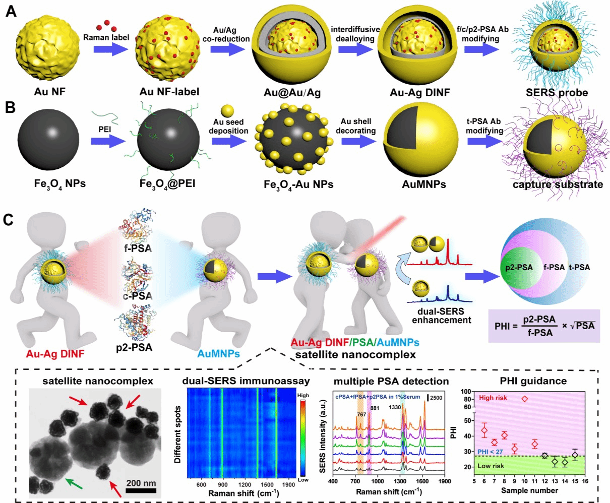 前列腺特异性抗原(PSA)被广泛用于前列腺癌(PCa)的液体活检,但由于特异性差,仍然面临极大的挑战。该研究报道了一种SERS卫星纳米复合免疫分析法,该分析法由具有强大、稳定和可重现的SERS信号的Au-Ag DINF和具有磁捕获和SERS放大功能的AuMNPs组成,用于对多种PSA进行高灵敏度的传感,从而实现潜在的PCa筛查。该项工作引入了一种多种PSA介导的前列腺健康指数(PHI)检测,显著增加了PCa的预测准确性和特异性,尤其是tPSA水平在“诊断灰区”的患者。